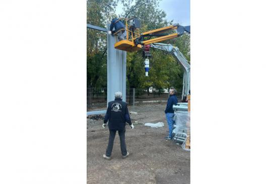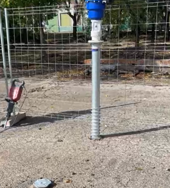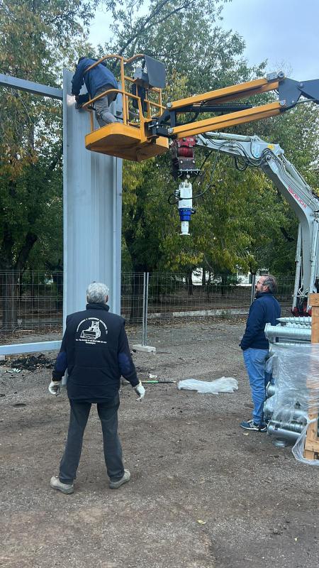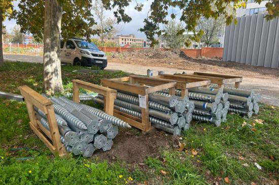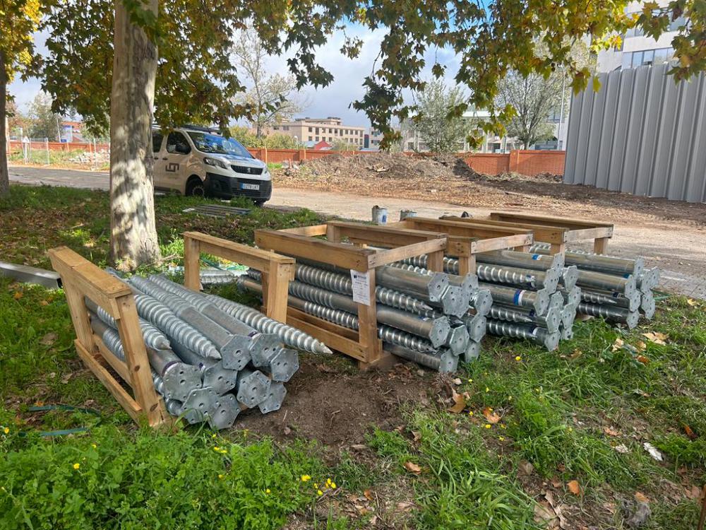 Por otro lado, otra empresa del Grupo Apimet aporta el sistema de cimentación mediante tornillos Krinner, una solución innovadora que sustituye a las cimentaciones tradicionales de hormigón. Este sistema permite una ejecución rápida, limpia y precisa de la cimentación, sobre la que se ancla directamente la estructura metálica que soporta las chapas autoportantes.